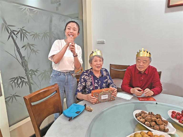 在“长者生日会”的前几天,社区工作人员就会为当月过生日的老人发放邀请卡。“长者生日会”当天,社区食堂里会早早摆好蛋糕、长寿面、生日帽等物品。老人们围坐在一起,跟着旋律唱生日歌,你一言我一语唠着家常,欢笑声此起彼伏。“每次看到老人们开心的表情,我就觉得所有的忙碌都值了。”张文静笑着说。