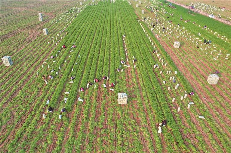 沙苑红萝卜是大荔县特色农产品。11月21日,在大荔县韦林镇,当地群众正在采收红萝卜。