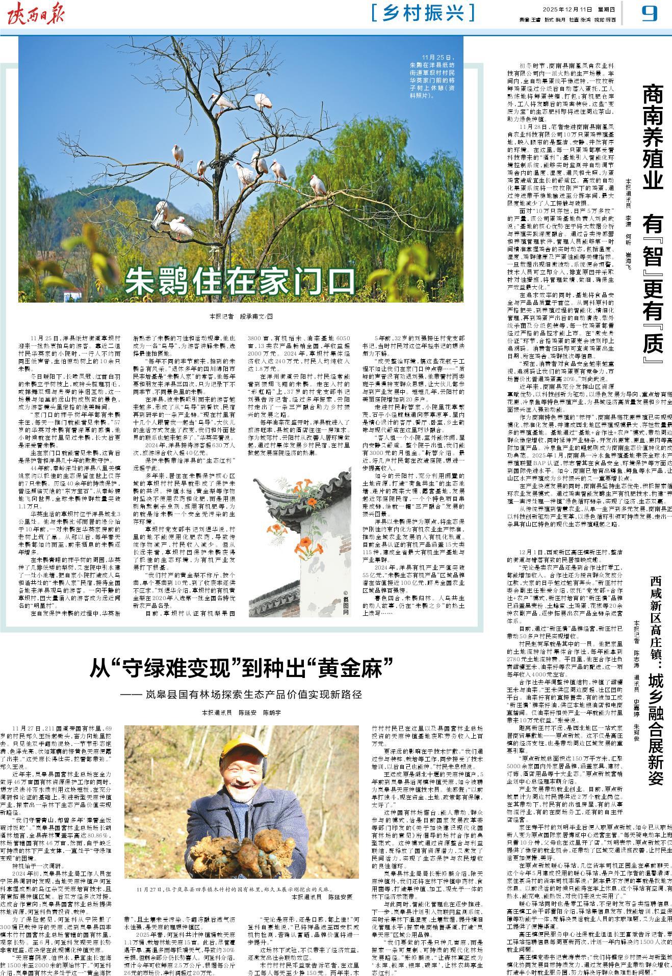 在洋州街道云阳村,村民经常能看到振翅飞翔的朱鹮。走在入村的“彩虹路”上,37岁的村党支部书记刘强告诉记者,经过多年探索,云阳村走出了一条三产融合助力乡村振兴的发展之路。