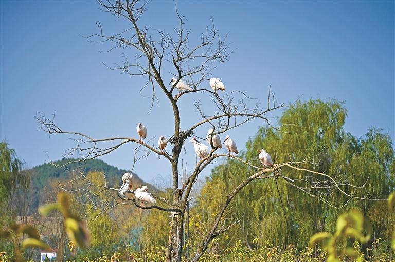 冬日暖阳下,长喙凤冠、红首白羽的朱鹮立于树枝上,或转头梳理羽毛,或挥舞双翅与身旁的伴侣互动,这一场景与如黛的远山构成别致的景色,成为游客镜头里定格的绝美瞬间。
