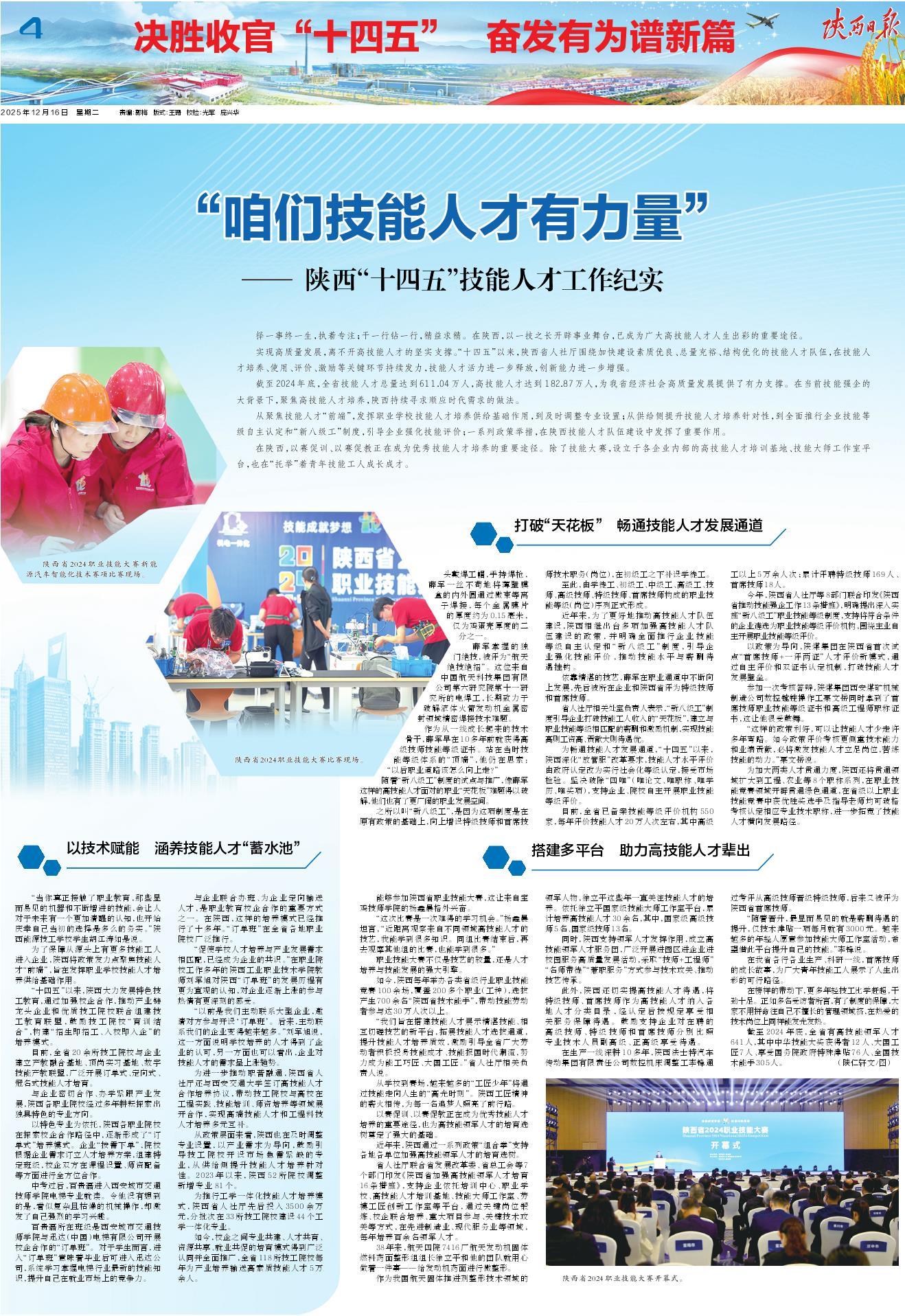 从聚焦技能人才“前端”,发挥职业学校技能人才培养供给基础作用,到及时调整专业设置;从供给侧提升技能人才培养针对性,到全面推行企业技能等级自主认定和“新八级工”制度,引导企业强化技能评价;一系列政策举措,在陕西技能人才队伍建设中发挥了重要作用。