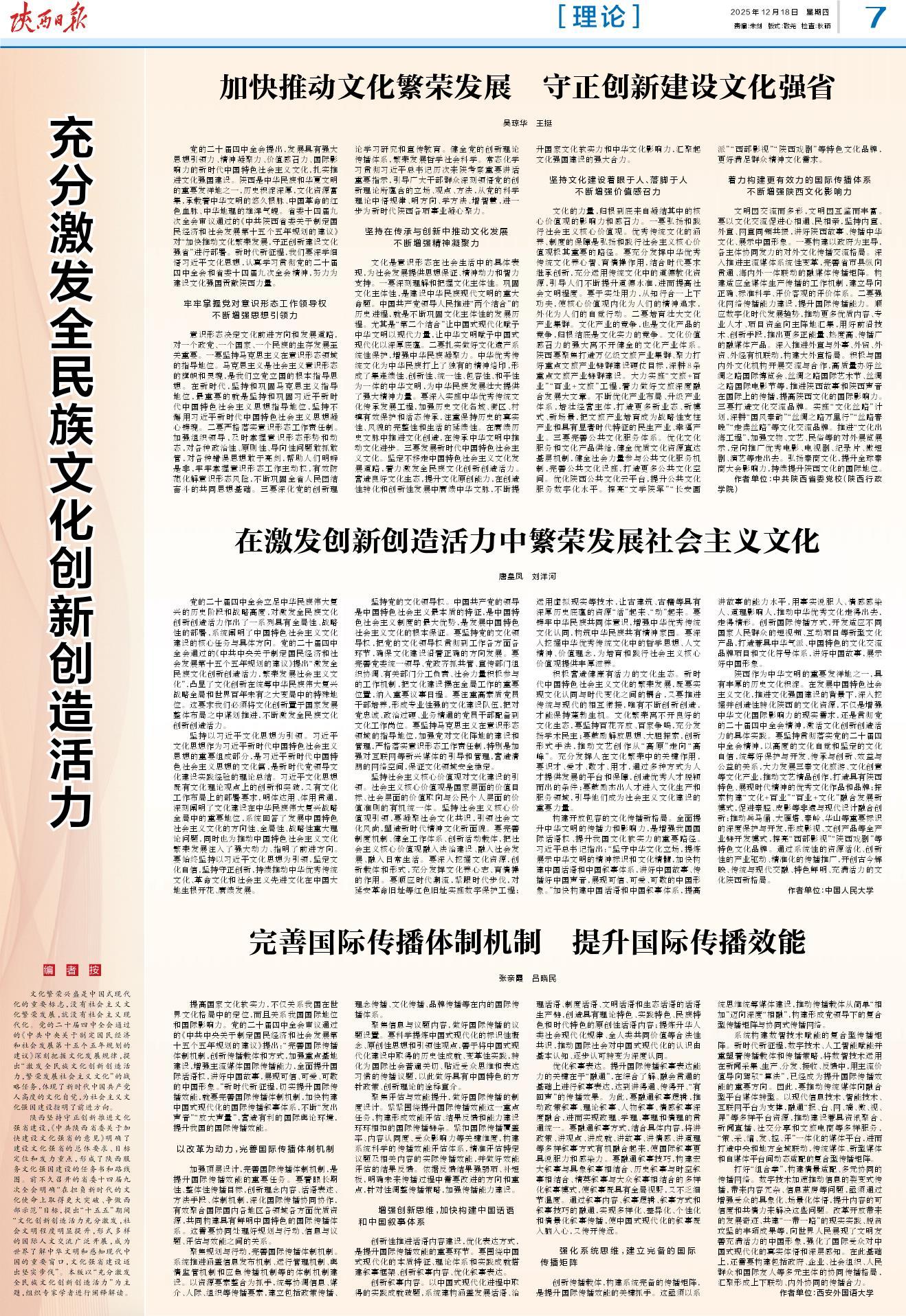 陕西作为中华文明的重要发祥地之一,具有丰厚的历史文化积淀。在发展中国特色社会主义文化,推进文化强国建设的背景下,深入挖掘并创造性转化陕西的文化资源,不仅是增强中华文化国际影响力的现实需求,还是贯彻党的二十届四中全会精神,激活文化创新创造活力的具体实践。要坚持贯彻落实党的二十届四中全会精神,以高度的文化自觉和坚定的文化自信,统筹好保护与开发、传承与创新、效益与公益的关系,大力发展三秦文化旅游、文化创意等文化产业,推动文艺精品创作,打造具有陕西特色、展现时代精神的优秀文化作品和品牌;探索构建“文化+百业”“百业+文化”融合发展新模式,促进秦腔、皮影等非遗与现代设计融合创新;推动兵马俑、大雁塔、秦岭、华山等重要标识的深度保护与开发,形成影视、文创产品等全产业链开发模式,擦亮“西部影视”“陕西戏剧”等特色文化品牌。通过系统性的资源活化、创新性的产业驱动、精准化的传播推广,开创古今辉映、传统与现代交融、特色鲜明、充满活力的文化陕西新格局。