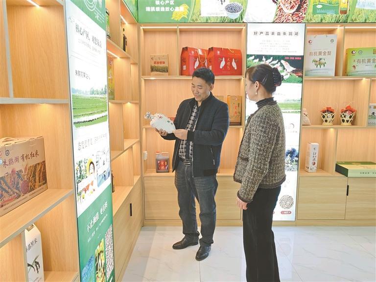 12月3日,洋县纸坊街道草坝村党支部书记刘煜华(左)在给游客介绍有机大米(资料照片)。