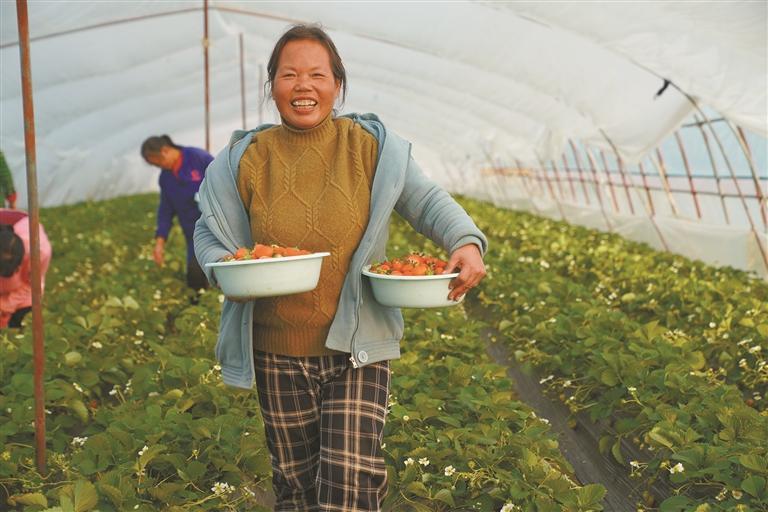 12月12日,在西安市临潼区骊美薯业有限公司种植园,詹林红端着刚采摘的草莓喜笑颜开。 本报通讯员 王三合摄