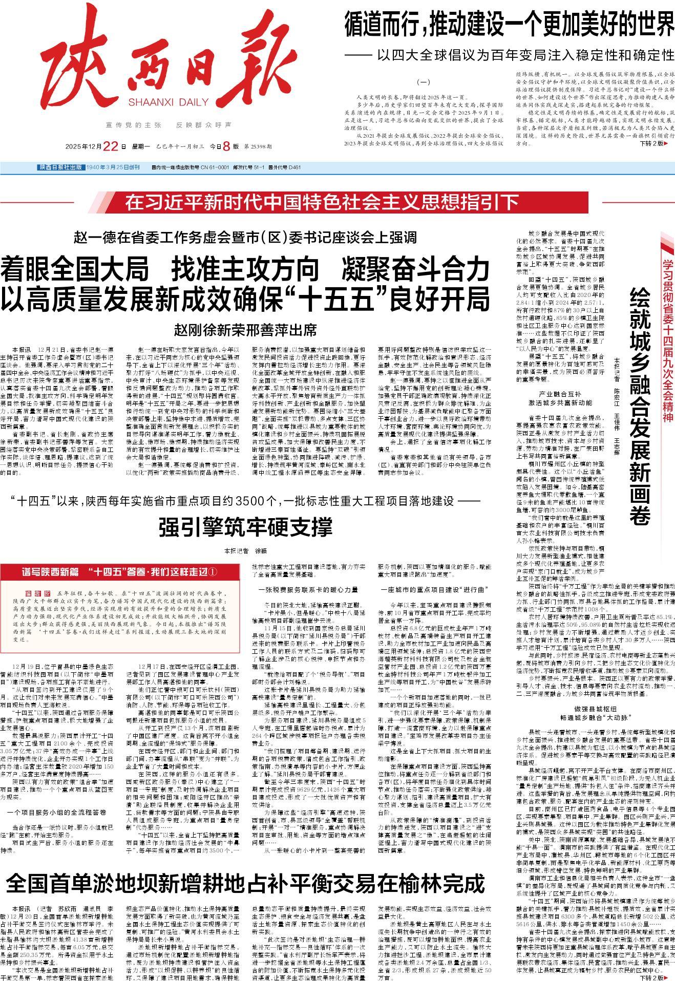 本报讯 12月21日,省委书记赵一德主持召开省委工作务虚会暨市(区)委书记座谈会。他强调,要深入学习贯彻党的二十届四中全会、中央经济工作会议精神和习近平总书记历次来陕考察重要讲话重要指示,认真落实省委十四届九次全会部署,着眼全国大局,找准主攻方向,科学确定明年发展目标和任务举措,切实凝聚团结奋斗合力,以高质量发展新成效确保“十五五”良好开局,奋力谱写中国式现代化建设的陕西新篇章。