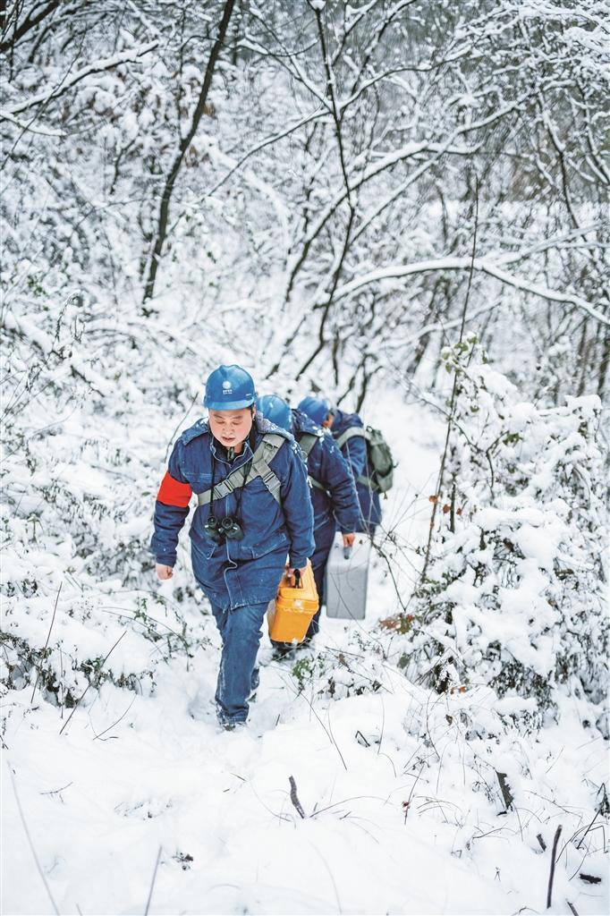 国网陕西电力工作人员顶风冒雪深入秦岭针对输电线路开展特巡。