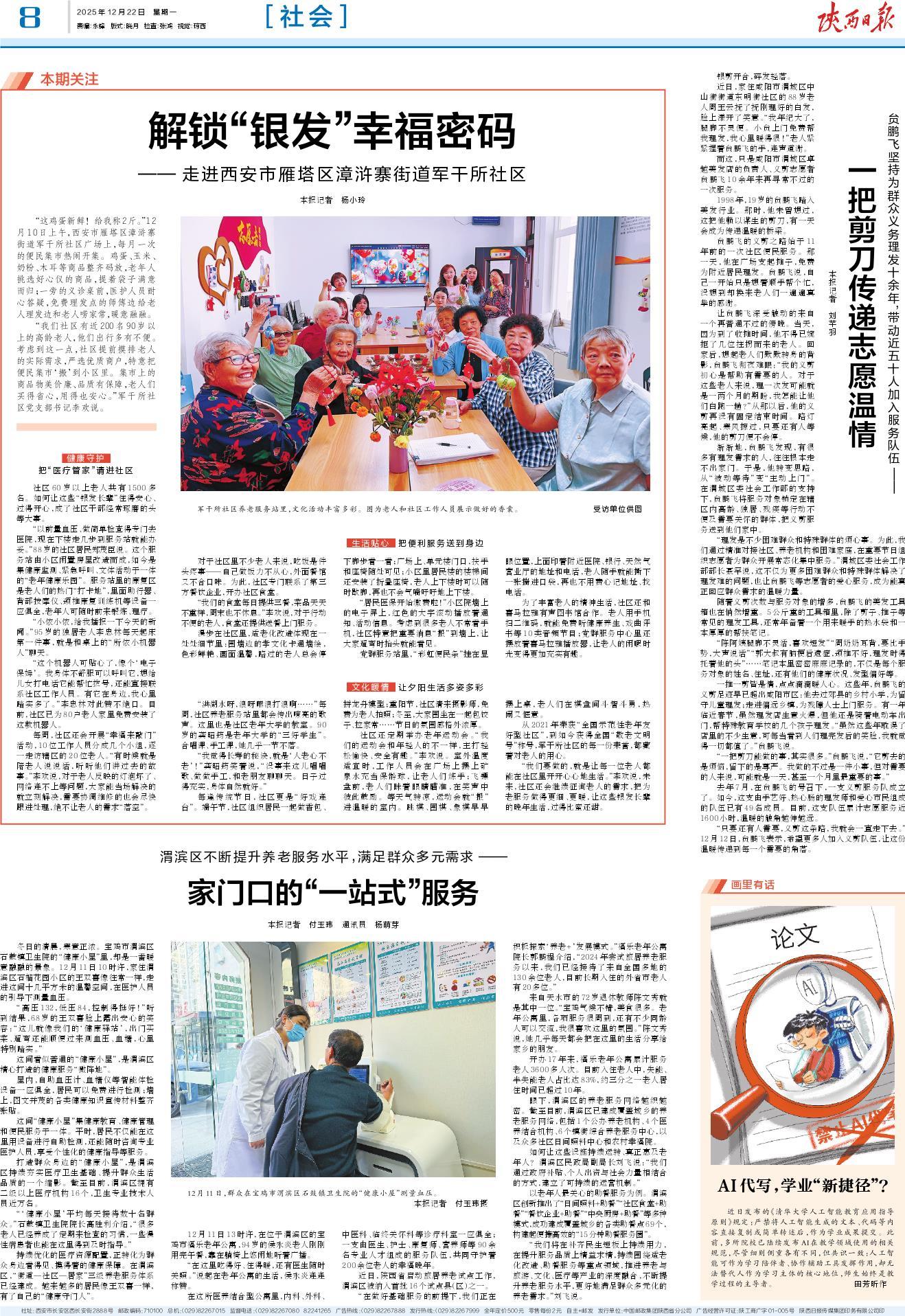 “这鸡蛋新鲜!给我称2斤。”12月10日上午,西安市雁塔区漳浒寨街道军干所社区广场上,每月一次的便民集市热闹开集。鸡蛋、玉米、奶粉、木耳等商品整齐码放,老年人挑选好心仪的商品,提着袋子满意而归;一旁的义诊桌前,医护人员耐心答疑,免费理发点的师傅边给老人理发边和老人唠家常,暖意融融。