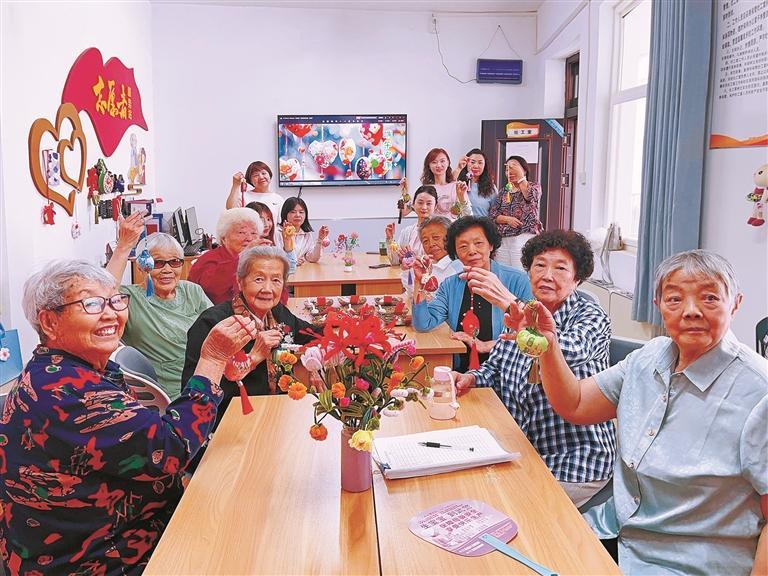 军干所社区养老服务站里,文化活动丰富多彩。图为老人和社区工作人员展示做好的香囊。 受访单位供图
