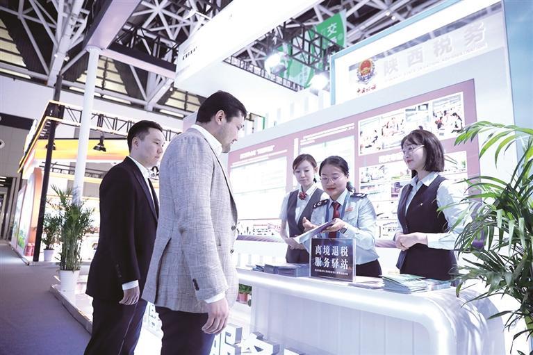 在第九届丝博会场馆,省、市、区三级税务部门联合设立“护航丝博·税务服务驿站”,向境外客商介绍离境退税“即买即退”便利化举措。