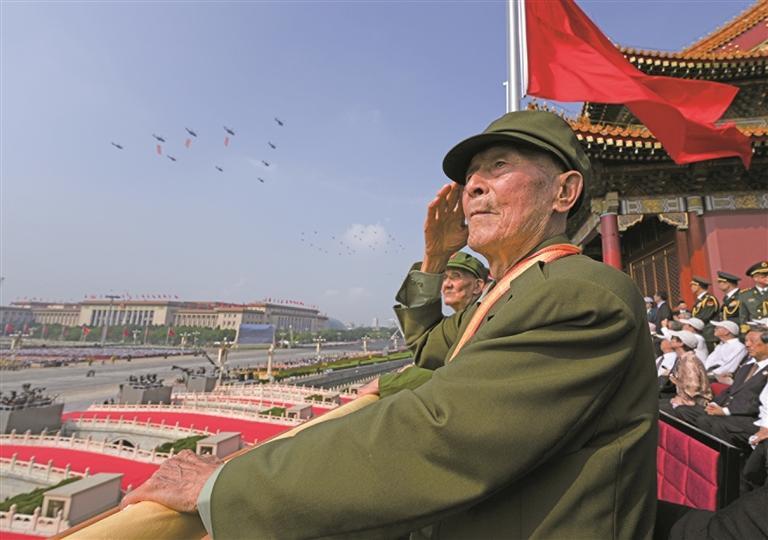 城楼上,从烽火硝烟中走来的抗战老战士老同志受邀观礼,胸前佩戴的“中国人民抗日战争胜利80周年”纪念章熠熠生辉。