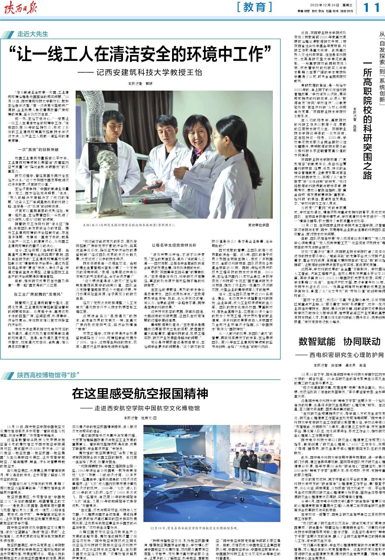 “在校研究生规模持续扩大,导学育人方式发生深刻变化,研究生心理健康工作面临主动发现难等问题。”西安电子科技大学党委研究生工作部部长张君博介绍,学校近年来以“数智赋能、协同联动”为牵引,通过建立工作标准、开发信息平台、强化育人队伍、优化资源供给、形成工作合力,推动研究生心理育人工作提质增效。