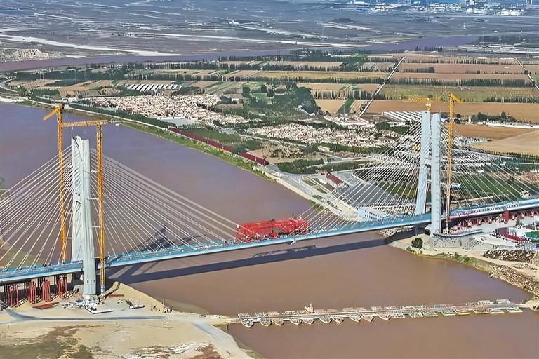 “在乌海黄河特大桥建设中,我们创新采用‘纵向运输—整体提升—90度旋转’安装工艺,实现8000余吨钢梁‘毫米级’精准安装,并全程避开黄河主航道,最大限度保护水域生态。在磴口黄河特大桥建设中,我们采用‘配重提升法’,并借助BIM模拟与同步提升系统,在风沙大、昼夜温差达15摄氏度的环境中,先后完成6次大节段整体提升,高效率、高精度完成施工作业。”中铁宝桥党委书记、董事长侯映晖说。