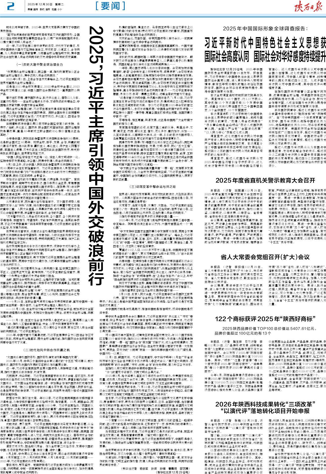 本报讯 (记者 陶玉琼 见习记者 李畅)12月26日,以“品牌引领发展,创新赋能未来”为主题的2025陕西品牌发展交流大会在西安举行。会议发布了2025年“陕西好商标”评价结果及2025陕西品牌价值TOP100名单。其中,“银桥”“红星·软香酥”等122个商标获评2025年“陕西好商标”,“旭峥果蔬”等11个商标获评2025年“最具成长潜力商标”。