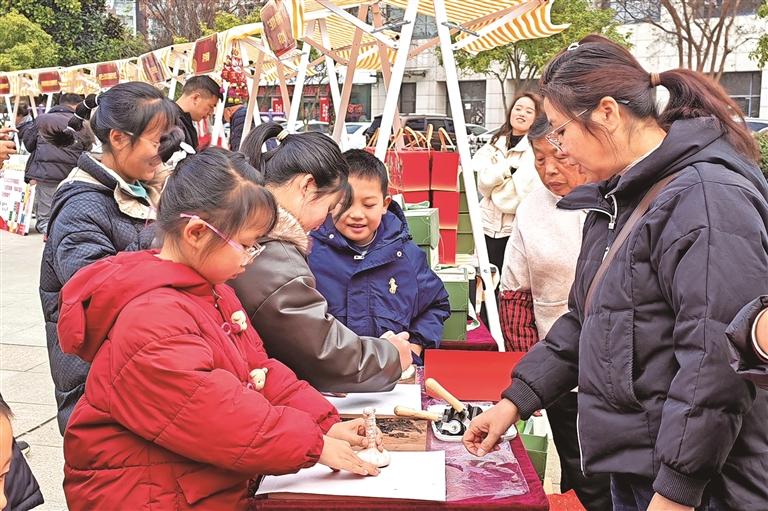 2月4日,一场集技艺展示、互动体验与产品展销于一体的文化盛宴在汉中市南郑区开启。本次活动汇集了南郑区多项非遗代表性项目与特色文创产品,在满足市民年货采购需求的同时,让市民​感受非物质文化遗产的独特魅力。图为孩子们在非遗代表性项目——汉中民间木版图画拓印、南郑剪纸体验区学习技艺。 本报通讯员 何祥弘摄