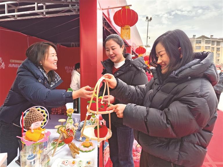 2月3日,永寿县在县中心广场举办“金马纳福迎新春 惠享年货乐万家 永寿县2026新春年货购物节”活动。本次年货节设置展位100余个,还吸引了江苏靖江的企业参展。图为2月3日,群众在永寿县马坊镇展位上选购手工艺品。 本报通讯员 李建龙摄