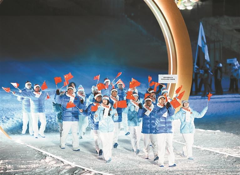 中国体育代表团共286人,其中运动员126人,将参加7个大项、15个分项、91个小项的角逐,创下中国冬奥会境外参赛项目最多、运动员规模最大的新纪录。开幕式上,速度滑冰运动员宁忠岩和短道速滑运动员张楚桐共同担任中国代表团旗手,引领队伍入场。
