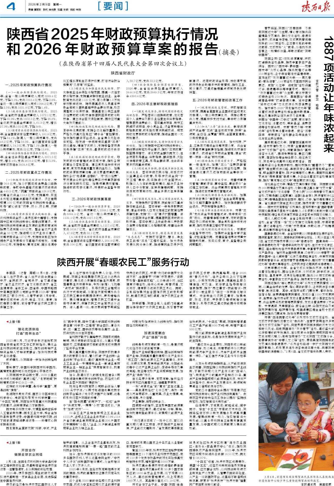 本报讯 (记者 周明)2月6日,记者从省人社厅获悉:省人社厅近日会同省公安厅、省民政厅、省司法厅、省交通运输厅、省农业农村厅、省文化和旅游厅、省卫生健康委、省总工会、团省委、中国铁路西安局集团有限公司联合开展2026年“春暖农民工”服务行动,从春节前到3月中旬,集中实施关爱、出行、就业、文化、健康、维权等服务措施,做好春节前后农民工服务保障工作。
