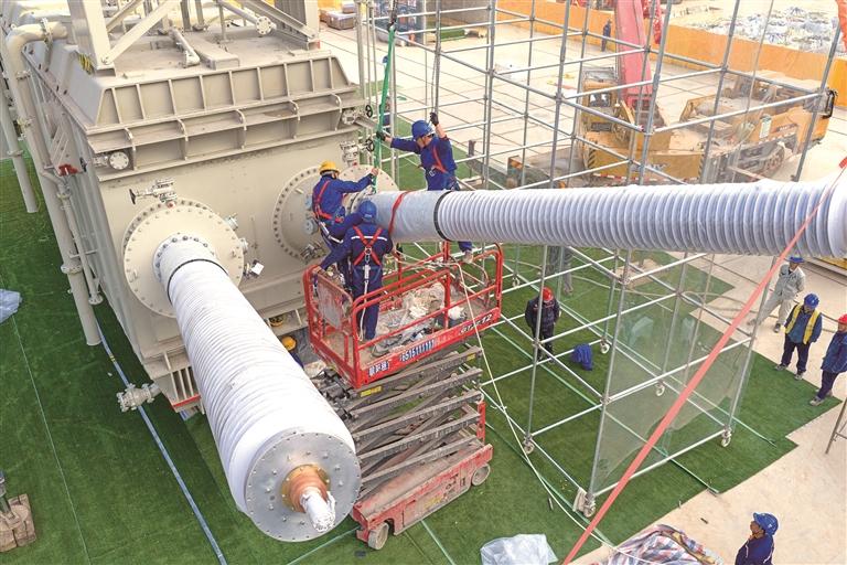 1月29日,电力工人在安装换流变压器。