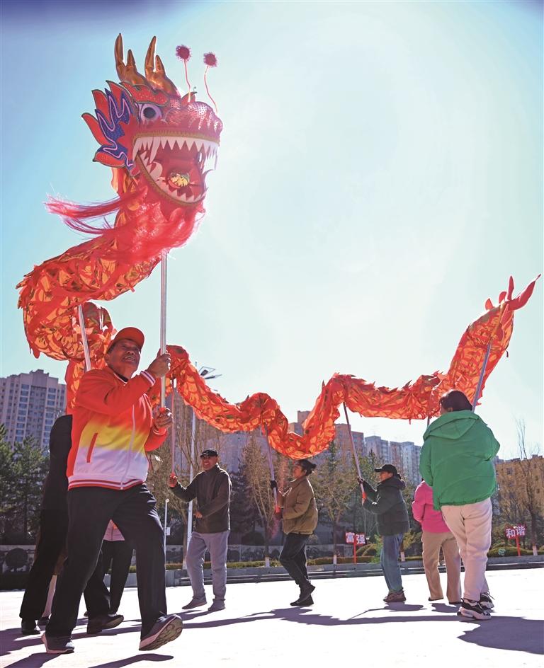 2月7日,舞龙爱好者在延安市文化馆广场进行舞龙健身表演。 本报通讯员 王德荣摄