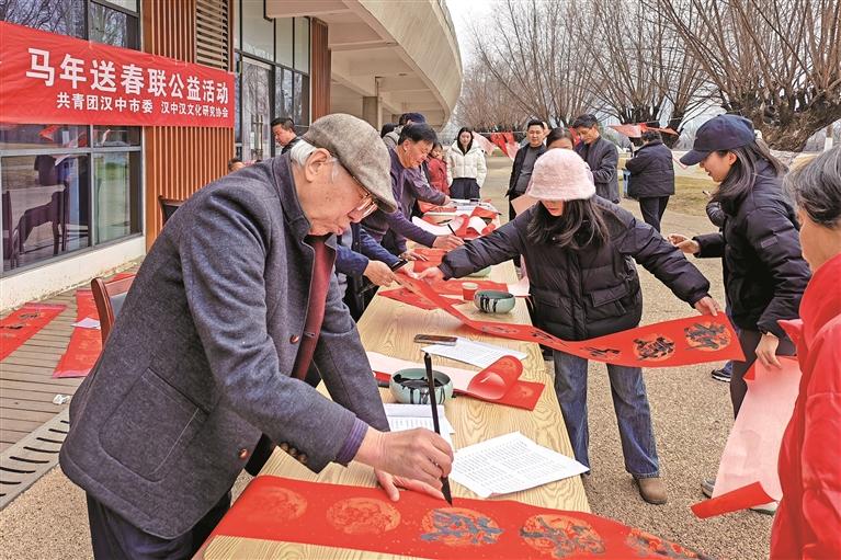2月8日,在汉中市天汉湿地公园天汉长街蔡伦广场,多位书法家开展义务送春联活动,以笔墨为媒传递新春祝福。 本报通讯员 何祥弘摄