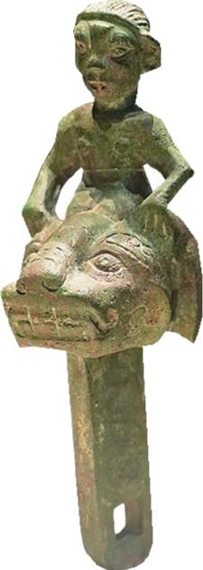 据考证,西周车辖多为单一兽形,而此件将人像与虎首结合,在目前出土的车马器青铜构件中比较少见。