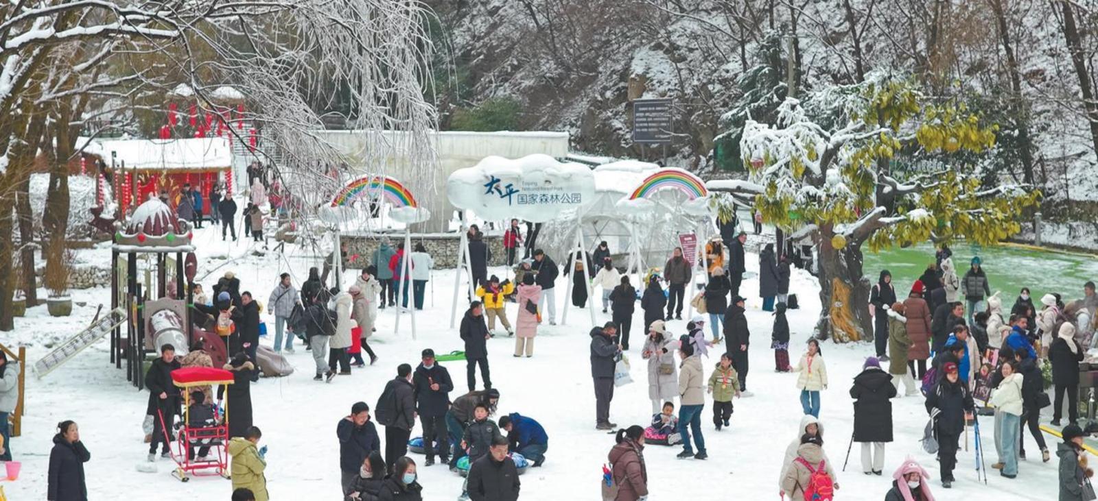 作为秦岭北麓的老牌山岳景区,太平国家森林公园今年推出“登山+戏雪”组合产品,让沉寂的冬日焕发新活力。该景区工作人员任颖超介绍,往年冬季受积雪和交通限制,景区客流量有限。2025年12月以来,景区自购融雪盐,出动皮卡清理景区外围13公里道路,实现“快封快解”,同时打造彩虹广场戏雪区,客流量提升明显。“围绕年轻人和亲子家庭的游玩需求,我们重点打造休闲戏雪项目,让大家在大自然中放松身心。”任颖超说,“景区每天清理步道积雪,目前开放了钟潭瀑布、龙口瀑布等安全区域,让游客能欣赏到‘冰瀑与雾凇同框’的独特景观。”