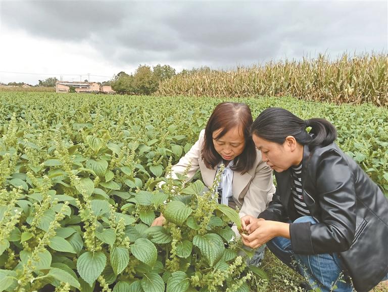 二〇二五年九月,王桂芳(左)和同事在彬州市永乐镇永乐村进行紫苏产量预测(资料照片)。 受访者供图