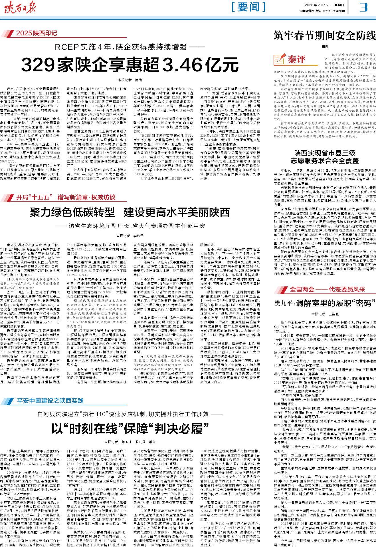 省市县三级枢纽型志愿服务联合会的全覆盖,对完善志愿服务工作体系、促进全省志愿服务事业长远发展具有重要意义。近年来,陕西广大志愿者、志愿服务组织、志愿服务工作者积极弘扬奉献、友爱、互助、进步的志愿精神,一大批志愿服务特色品牌脱颖而出,涵盖便民服务、生态保护、红色宣讲等11大类服务。陕西先后出台志愿者星级评定、政府购买服务等规范性文件,公布首批省级志愿服务组织“白名单”,建立项目扶持机制,2025年立项80个“志愿三秦”省级示范项目。750万名志愿者中,有年逾七旬的“银龄先锋”,也有朝气蓬勃的青年力量,累计服务时长超1.68亿小时,在基层治理、文明创建、乡村振兴等领域书写新时代的雷锋故事。
