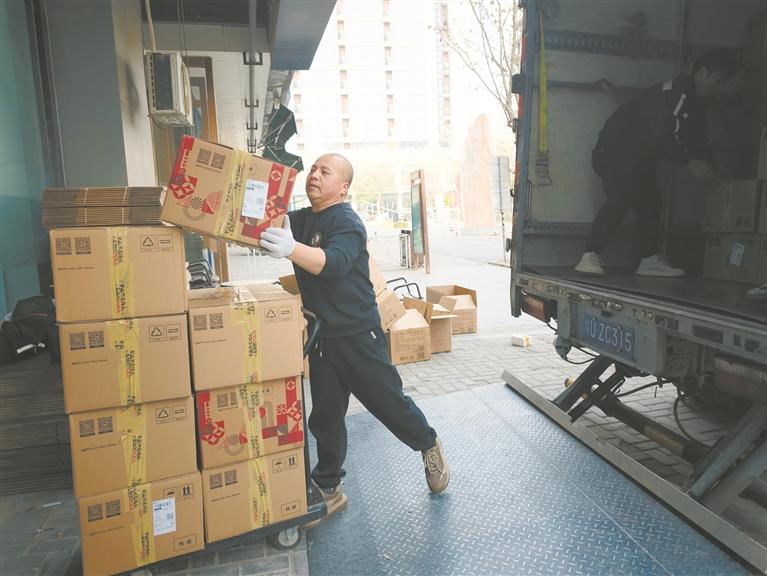 2月10日,陕西顺丰速运有限公司草滩十路营业点内,“智巢小队”队长索顺序将打包好的年货搬运上车。