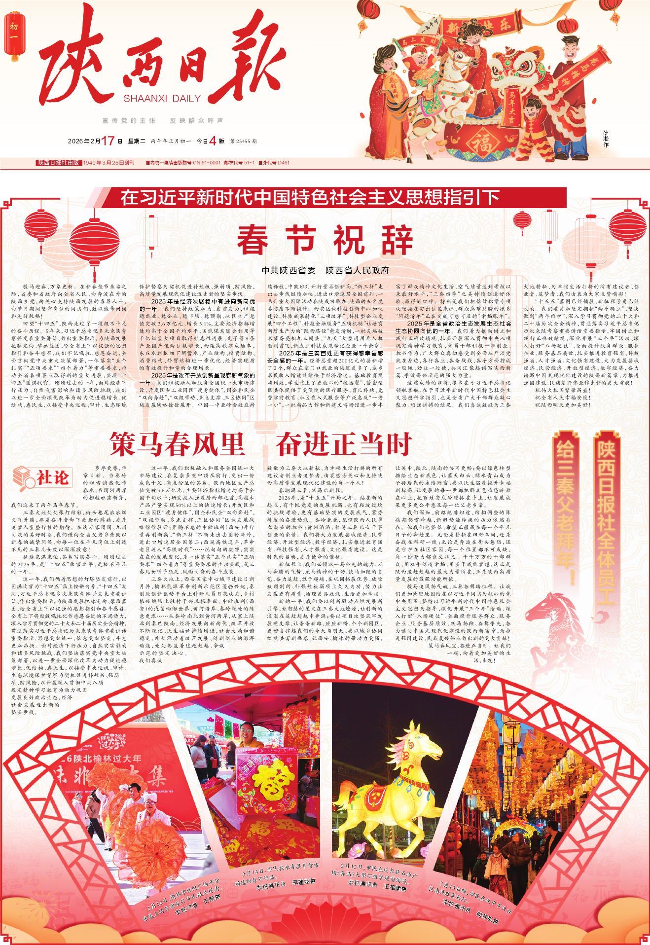 三秦大地处处张灯结彩,街头巷尾浓浓烟火气升腾,那是奋斗者卸下疲惫的慰藉,更是追梦人重整行装的期待。在这万家团圆、九州同庆的美好时刻,我们谨向全省父老乡亲致以新春的诚挚问候,向每一位在平凡岗位上创造不凡的三秦儿女致以深深敬意!