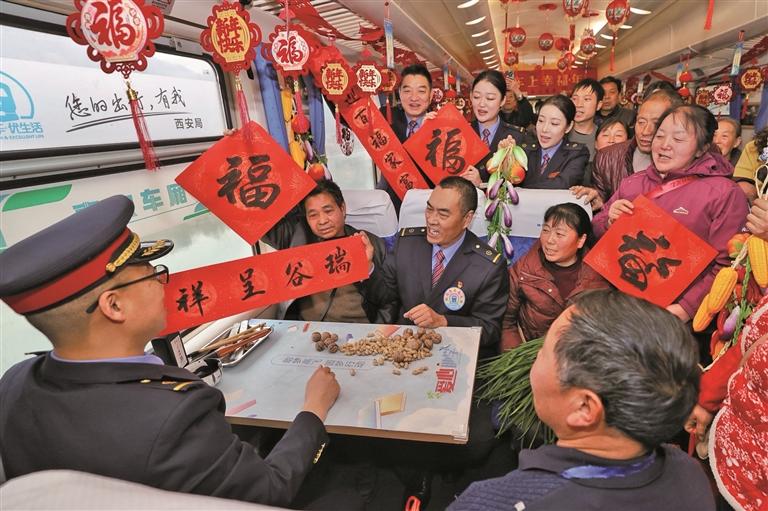 掌声刚落,两位年轻的列车工作人员便手持手绢,欢快地跳起舞。手绢上下翻飞,映着老乡们的笑脸,瞬间将年味“搅”得沸腾起来。