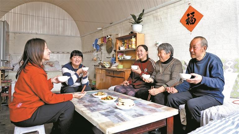 2月7日,宜川县丹州街道程落村村民薛凤英(右二)在家中与亲友共饮稠酒,同叙乡情。 本报通讯员 李文振摄