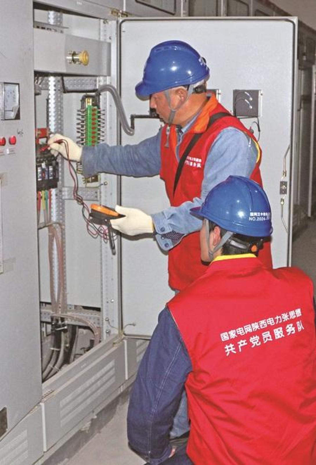 2月21日,国网陕西省电力有限公司汉中市南郑区供电分公司梁山园区供电所张思德共产党员服务队电工在龙岗家园小区检查低压电力运转情况。 本报通讯员 何祥斌摄