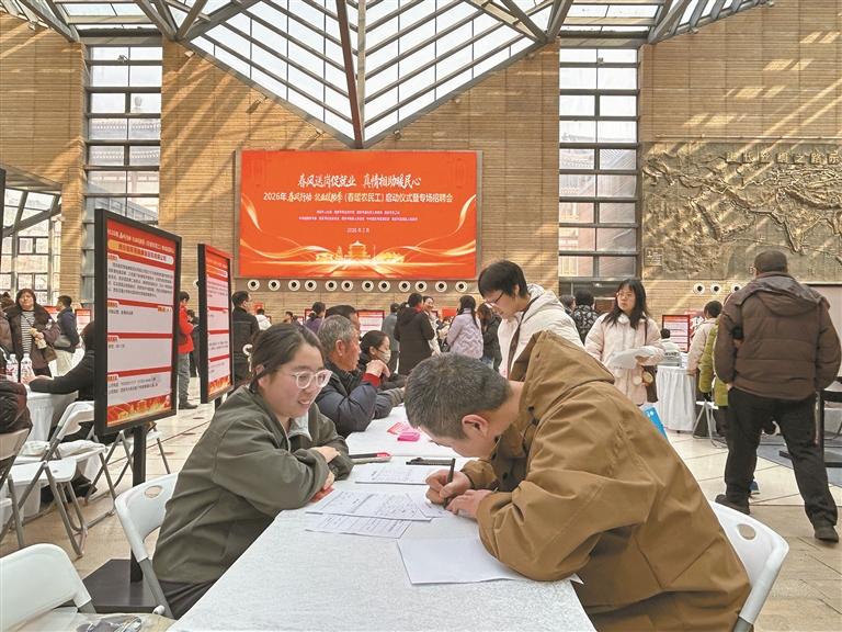 2月3日,西安市2026年春风行动现场招聘会上,求职者在填写相关信息(资料照片)。