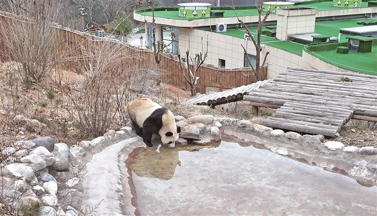 一只秦岭大熊猫在佛坪救护繁育研究基地喝水(2月12日摄)。本报记者 梁易炜摄