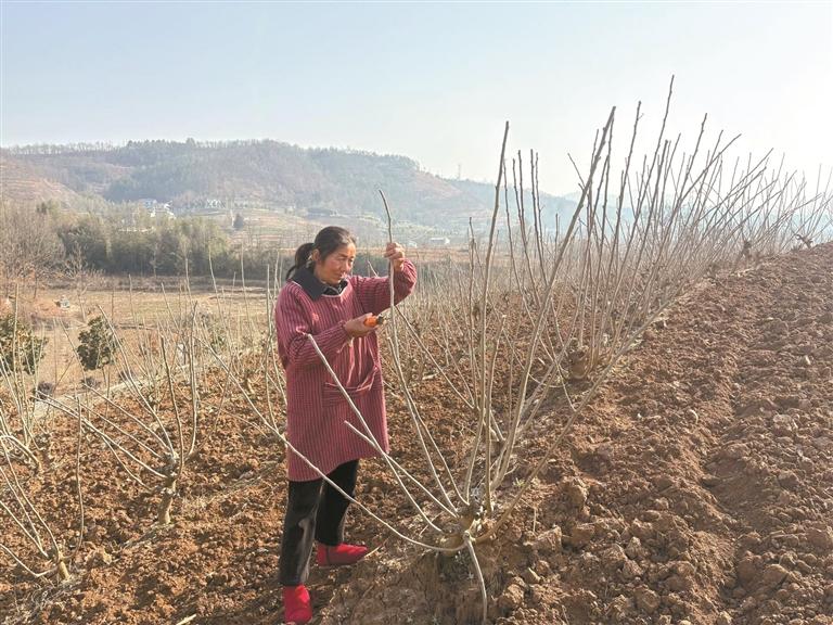 2月23日一早,村民曹世荣手持桑剪,在园中为桑树修枝。“剪掉杂枝,才能长出好桑叶!”她手上不停,笑着说。