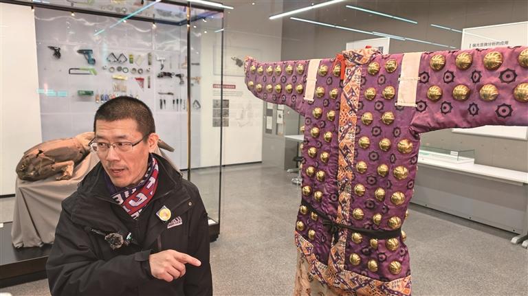 “这是当时秦代杂技演员的道具服。服饰上的这种紫色就是‘中国紫’,八角纹、泡钉都是比较典型的战国到西汉时期楚文化元素。”秦始皇帝陵博物院文物保护部主任、研究馆员夏寅说,“我们希望能够通过这些展示,以小见大,让观众对文物科技保护工作有更多了解。”