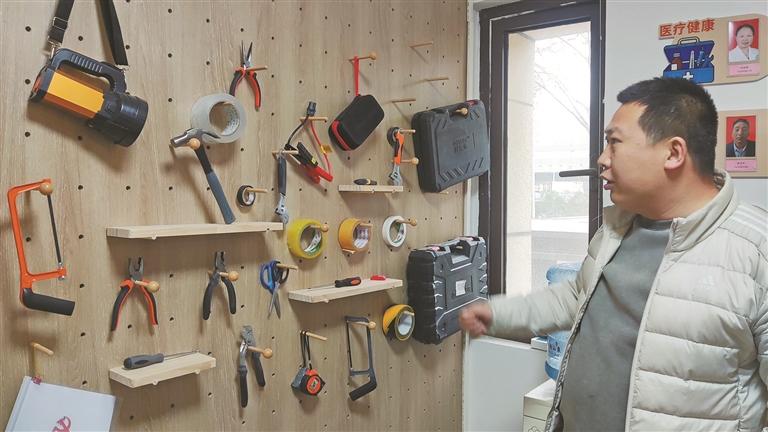 2月25日,莲湖区土门街道工农社区工作人员介绍党群服务中心为快递小哥准备的维修工具。