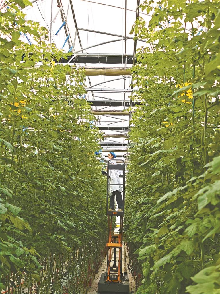 “眼下正值串番茄采收季,我们严格按照标准每周采收一次,每次采收5000斤左右。”刘佳仪说,“最近,棚里的主要工作是给串番茄缠头打杈、疏花疏果、落蔓,我每天进棚的第一件事就是巡棚,看看植株生长有没有异常、工人的操作是否按照标准。”说话间,她弯腰拨开藤蔓,仔细检查植株的长势。