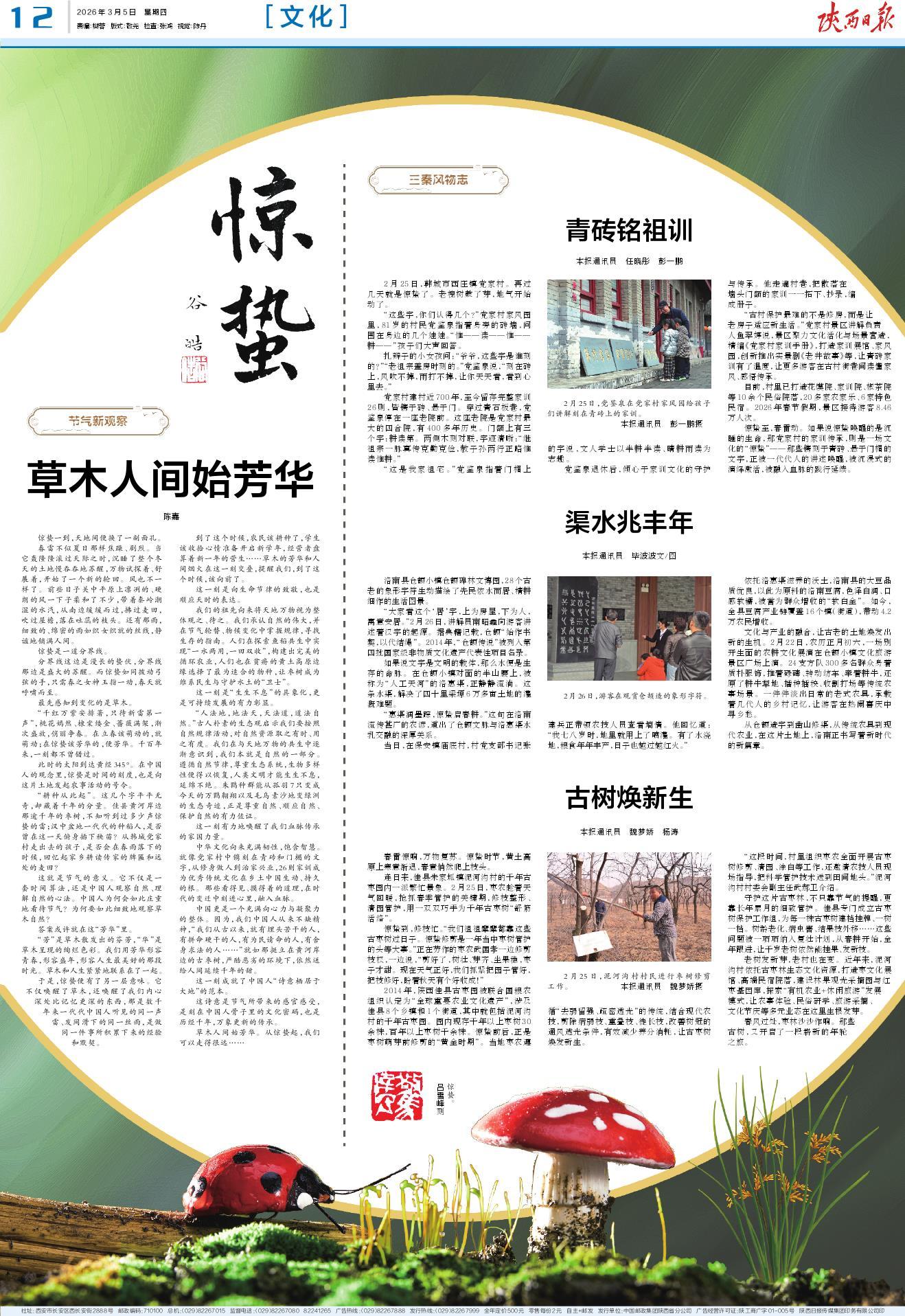 “耕种从此起”。这几个字平平无奇,却藏着千年的分量。佳县黄河岸边那逾千年的枣树,不知听到过多少声惊蛰的雷;汉中盆地一代代的种稻人,是否曾在这一天俯身插下秧苗?从韩城党家村走出去的孩子,是否会在春雨落下的时候,回忆起家乡耕读传家的牌匾和远处的麦田?