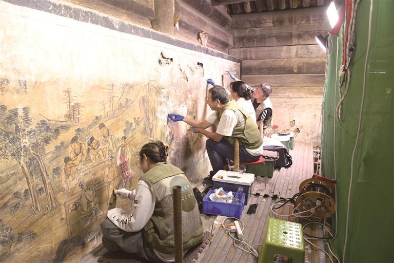 2025年7月,陕西省文物保护研究院(陕西省文物鉴定研究中心)工作人员修复东岳庙壁画(资料照片)。 受访者供图