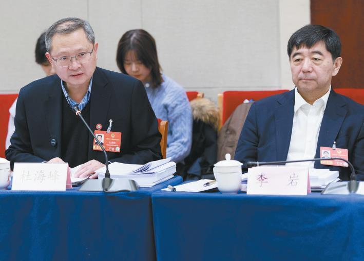 3月5日下午,参加全国政协十四届四次会议的委员分组审议政协常委会工作报告和提案工作情况报告。全国政协委员杜海峰(左)在分组会议上发言。