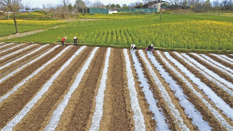 3月4日,汉中市南郑区梁山镇岭岗村村民在精细翻整甘蔗沟并覆盖地膜。