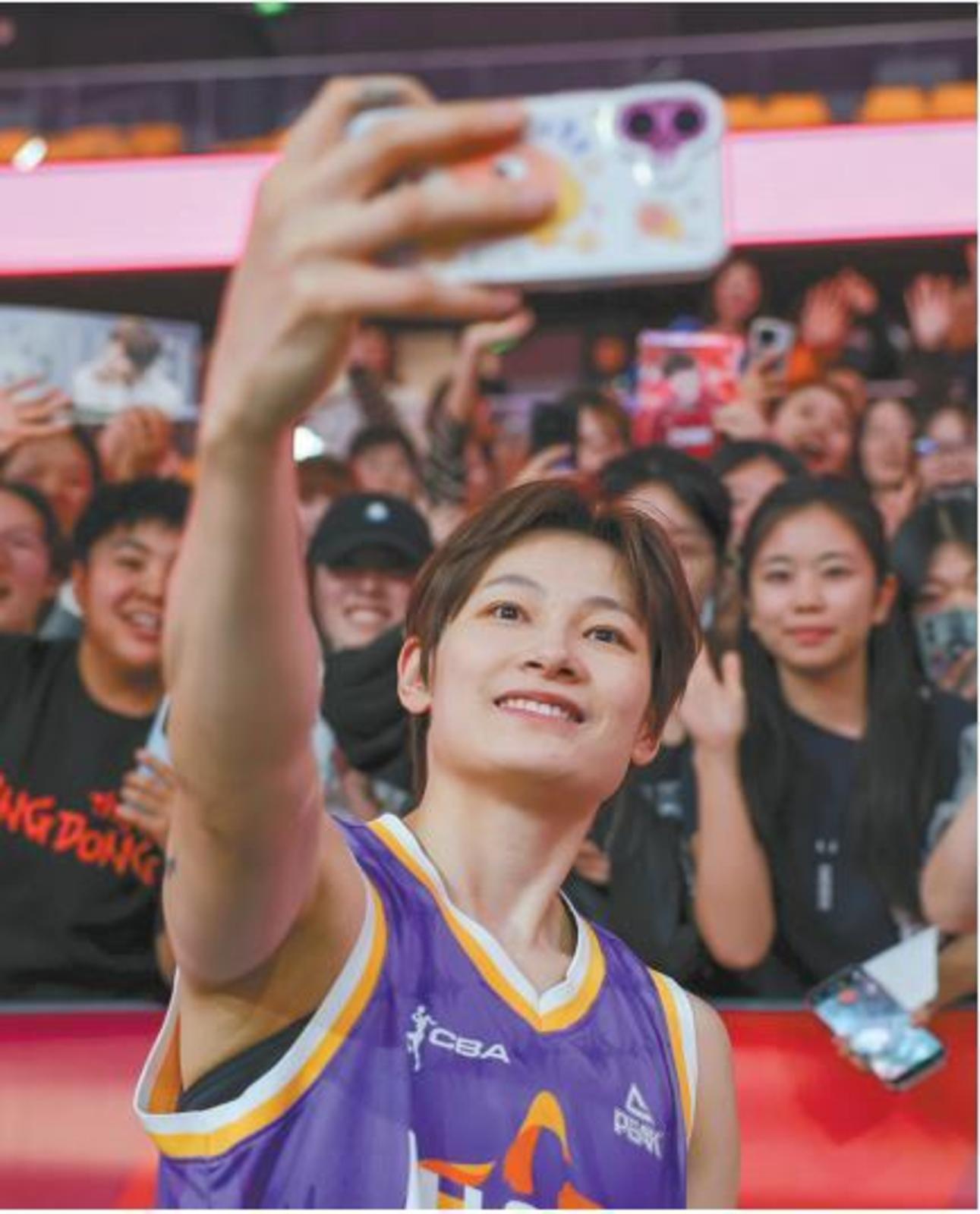 3月22日,2025—2026赛季WCBA全明星周末在西安落幕。图为比赛后,南区明星队球员杨力维与观众合影。本报记者 王熙摄