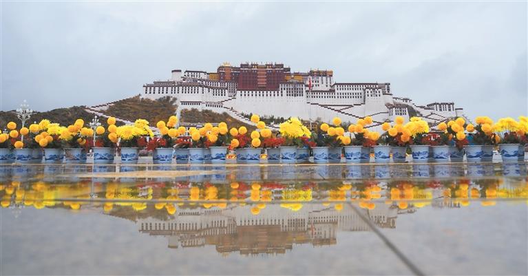 3月28日拍摄的布达拉宫广场。3月28日,西藏各族群众升国旗、唱国歌,载歌载舞,隆重纪念西藏百万农奴解放67周年。 新华社记者 丁增尼达摄