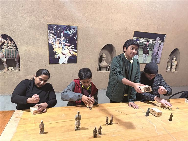 在秦俑村窑洞庭院内,是另一番秦韵盎然的景象。来自印度的游客在工作人员的指导下制作陶俑,沉浸式感受秦文化的魅力。