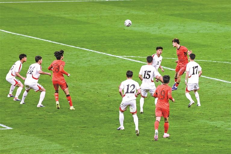 3月28日,在2026年西安国际青年足球锦标赛第二轮比赛中,中国U23男足(红)1∶1战平朝鲜U23男足(白)。图为中国U23球员头球攻门。