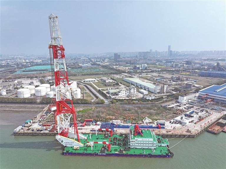 3月31日在江苏南通拍摄的156米动力定位打桩船“铁建大桥桩1”号(无人机照片)。