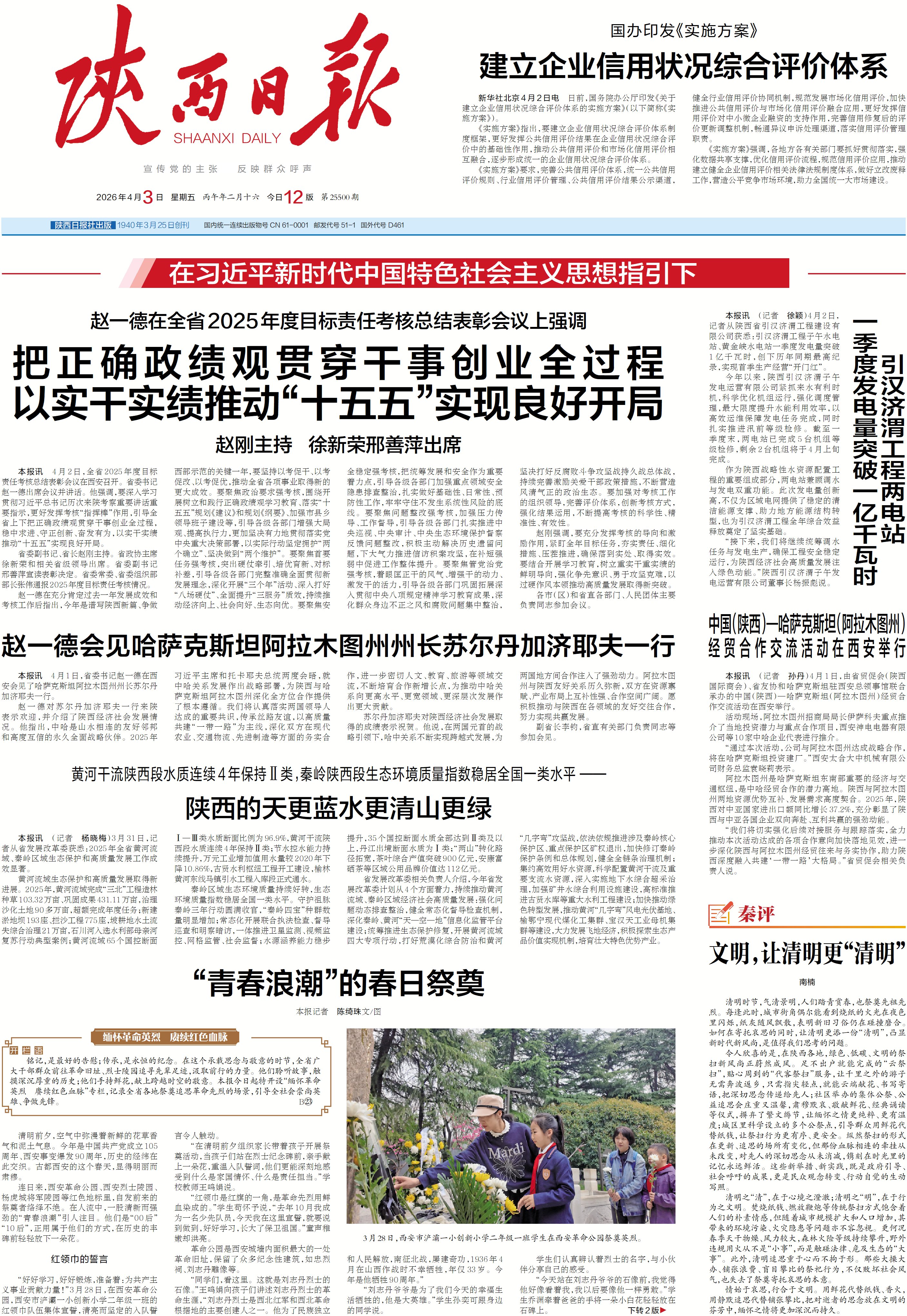 本报讯 4月2日,全省2025年度目标责任考核总结表彰会议在西安召开。省委书记赵一德出席会议并讲话。他强调,要深入学习贯彻习近平总书记历次来陕考察重要讲话重要指示,更好发挥考核“指挥棒”作用,引导全省上下把正确政绩观贯穿干事创业全过程,稳中求进、守正创新、奋发有为,以实干实绩推动“十五五”实现良好开局。