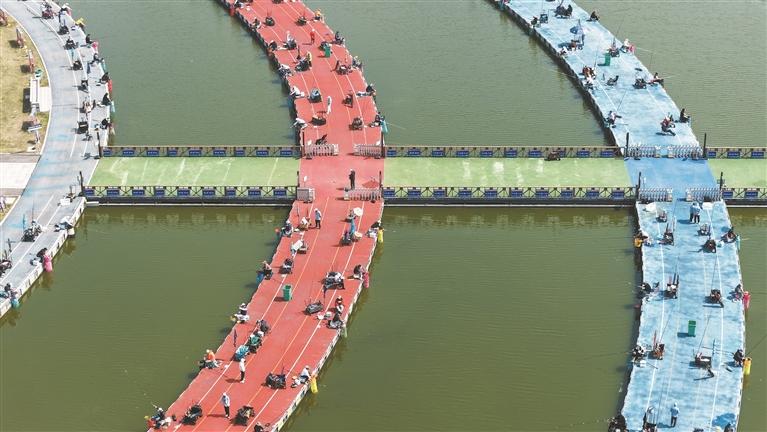 4月4日,垂钓爱好者在江苏省泗洪洪泽湖国际垂钓中心大圆塘参加钓鱼比赛(无人机照片)。清明假期,人们度假休闲,踏青游玩,释放“春日经济”新活力。 新华社发(许昌亮摄)